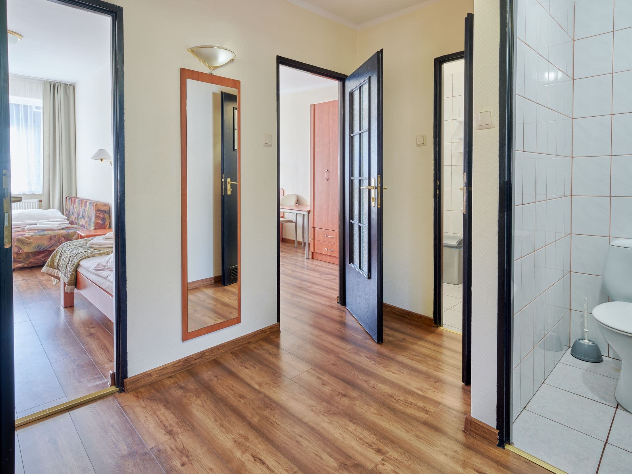 Szukasz pokoju na wakacje z całą rodziną lub w większym gronie? Rodzinne studio to idealna opcja dla 4 osób. Studio składa się z dwóch oddzielnych pokoi ze wspólnym przedsionkiem, toaletą i łazienką z prysznicem. Do dyspozycji są tu trzy łóżka pojedyncze i rozkładana sofa lub łóżko pojedyncze, podwójne i sofa.